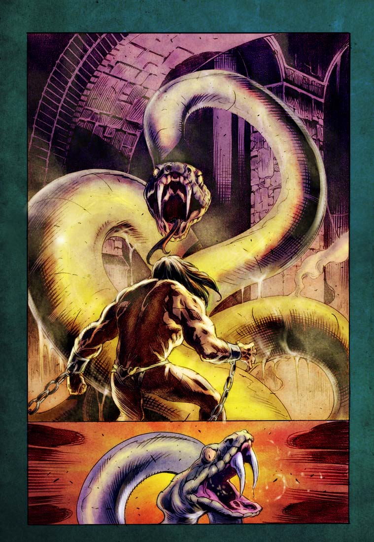 La segunda prueba de hoy es una página interior de Conan, más concretamente una de “La Ciudadela Escarlata”, de Tomás Giorello. La mayor diferencia con las otras pruebas de color que he hecho estos días radica en que el color se aplica directamente sobre el lápiz, no sobre tinta. Colorear sobre el lápiz en vez de sobre la tinta obliga a ser más preciso y cuidadoso al colorista, sobre todo en los contornos, ya que bajo el gris del lápiz sí que se “transparenta” todo cuanto el colorista hace, cosa que no pasa con el negro de la tinta. El resultado es un aspecto final más “artesano”.